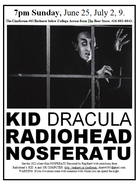 “What I like about The CineForum and Reg Hartt and what makes him a valuable figure is his belief in cinema as a living, breathing thing, something to be enjoyed and argued about, not genuflected at or framed on a wall and revered at a respected distance. In his presentations he refutes the conventional wisdom that films like THE BIRTH OF A NATION (1915), THE BATTLESHIP POTEMKIN (1925), and THE PHANTOM OF THE OPERA (1925) are better appreciated as historical artifacts than entertainments. To see KID DRACULA, his show that pairs F. W. Murnau’s NOSFERATU (1922) with Radiohead to surprisingly effective results is to be reminded that the classics were made for the raw public before they were made for cinema studies syllabi. I have rarely felt a film’s greatness in a classroom but I have often felt it at Reg Hartt’s CineForum.”—a cinema studies student.