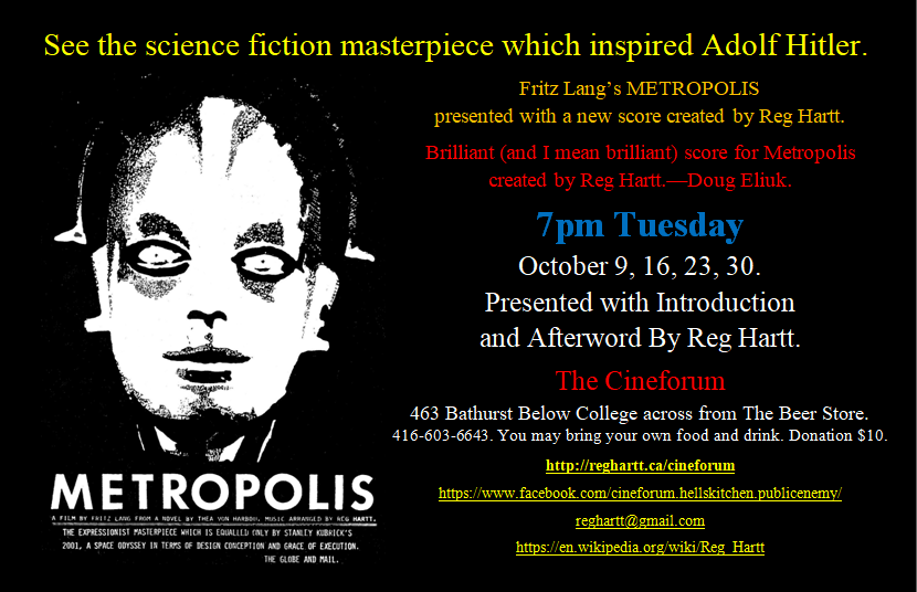 “What I like about The CineForum and Reg Hartt and what makes him a valuable figure is his belief in cinema as a living, breathing thing, something to be enjoyed and argued about, not genuflected at or framed on a wall and revered at a respected distance. In his presentations he refutes the conventional wisdom that films like THE BIRTH OF A NATION (1915), THE BATTLESHIP POTEMKIN (1925), and THE PHANTOM OF THE OPERA (1925) are better appreciated as historical artifacts than entertainments. To see KID DRACULA, his show that pairs F. W. Murnau’s NOSFERATU (1922) with Radiohead to surprisingly effective results is to be reminded that the classics were made for the raw public before they were made for cinema studies syllabi. I have rarely felt a film’s greatness in a classroom but I have often felt it at Reg Hartt’s CineForum.”—a cinema studies student.