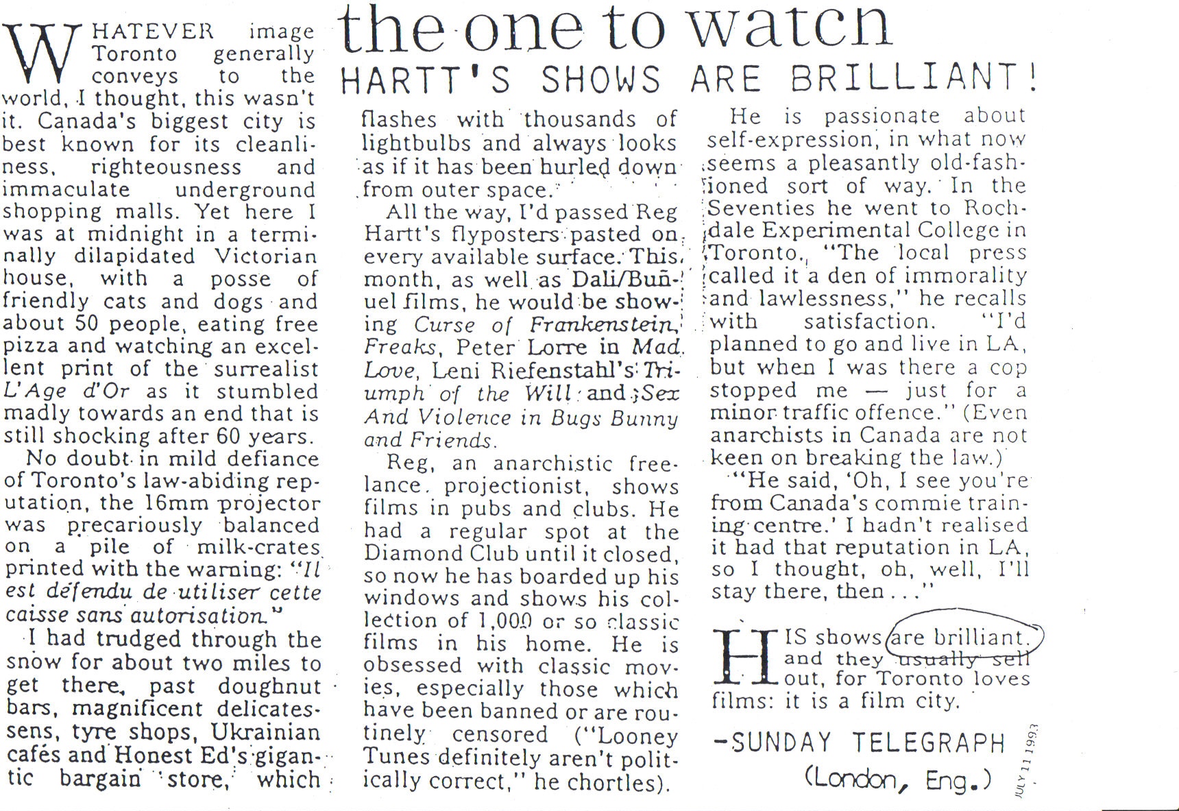 “What I like about The CineForum and Reg Hartt and what makes him a valuable figure is his belief in cinema as a living, breathing thing, something to be enjoyed and argued about, not genuflected at or framed on a wall and revered at a respected distance. In his presentations he refutes the conventional wisdom that films like THE BIRTH OF A NATION (1915), THE BATTLESHIP POTEMKIN (1925), and THE PHANTOM OF THE OPERA (1925) are better appreciated as historical artifacts than entertainments. To see KID DRACULA, his show that pairs F. W. Murnau’s NOSFERATU (1922) with Radiohead to surprisingly effective results is to be reminded that the classics were made for the raw public before they were made for cinema studies syllabi. I have rarely felt a film’s greatness in a classroom but I have often felt it at Reg Hartt’s CineForum.”—a cinema studies student.