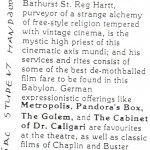 Will Sloan, at the time a young student, wrote in The UofT Varsity, “I seldom feel a film’s greatness in film class. I regularly feel it at Reg Hartt’s Cineforum.” That’s a helluva quote. When I put it on a poster Will freaked. “I did not write that for you to use it that way!” he cried. I had written was a sexy little fellow with girls hot for his body. He did not like that, either. He certainly qualifies to be a member of the sexless group Slide writes about which is a shame.
