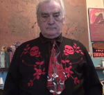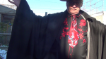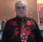 Take one Bugs Bunny tie, flat topped wide brimmed Hugh O’Brien/Wyatt Earp hat (from Lilliput Hats, Toronto), add the red skull version of my shirt and an authorized replica of the cape Bela Lugosi wore as Dracula. How’s that for mixing genres? Fun.