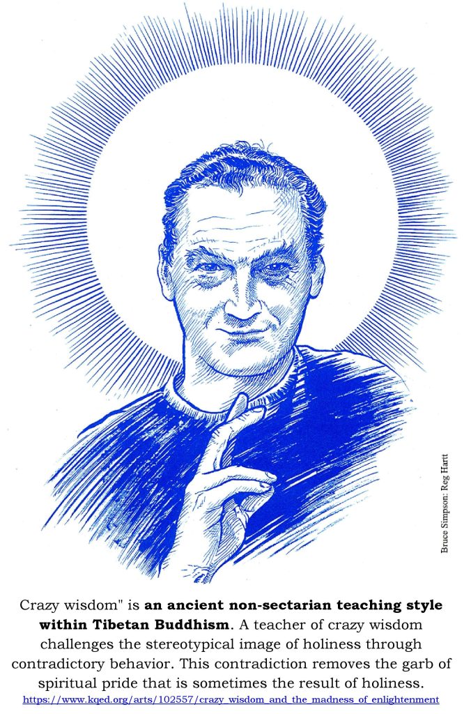 That stream of events continues to issue. Because they came into my life an amazing number of people have had their lives changed for the better. “You are a Crazy-Wisdom-Yogin,” said Jerzy Zaborksi, a high ranking Tibetan Lama who had accompanied the Dalai Lama on his first journey across Canada. I replied, “I hear crazy often enough. What does the rest of that mean?” “It is the highest compliment I, as a Buddhist, can pay. It means you are living absolutely the life you are teaching.” I said, “I would not say that. I know how far below the mark I fall. Would you care for a beer?” Jerzy said, “Yes,” adding, “If you quote me put a flame after my name to indicate my rank.” Luckily, that night I had a fridge filled with beer. Still have the wrong attitude. B.Y.O.B.