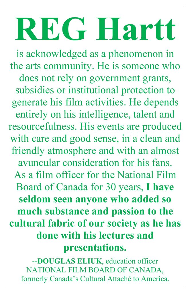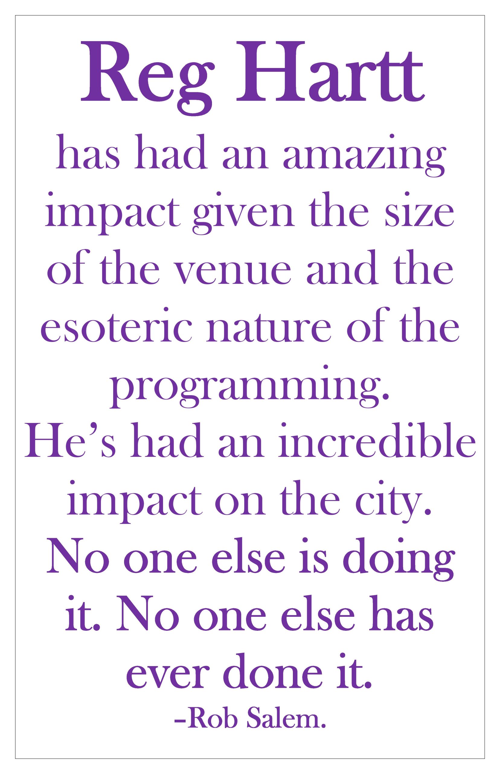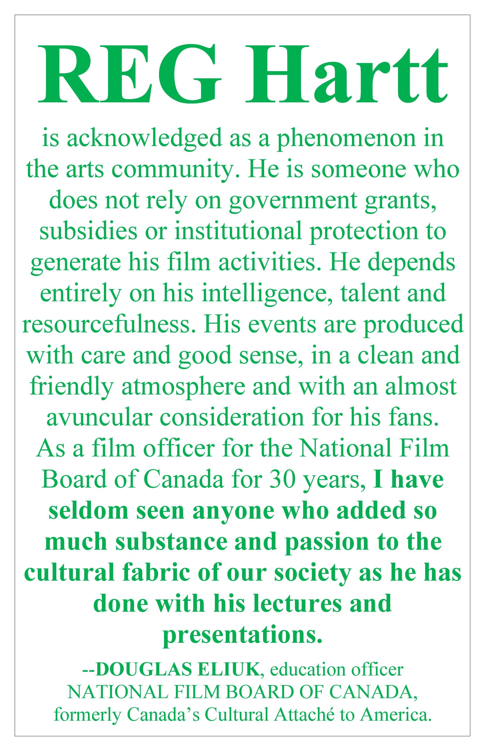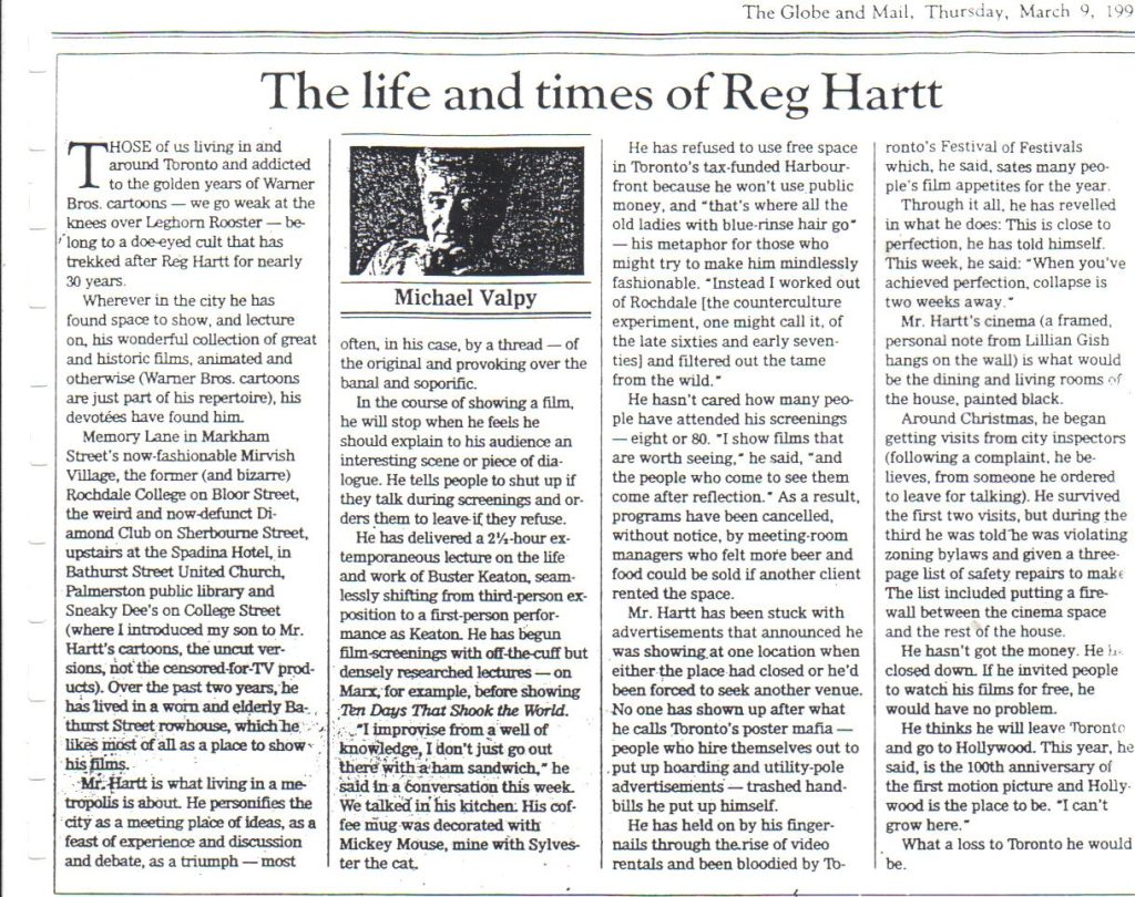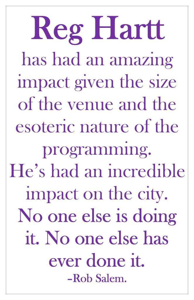 Laura Lind, writing in EYE weekly, stated, “Reg Hartt is everything Jane Jacobs wrote about in THE DEATH AND LIFE OF GREAT AMERICAN CITIES.”
