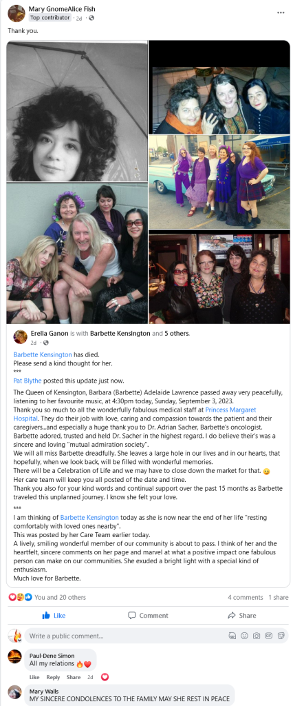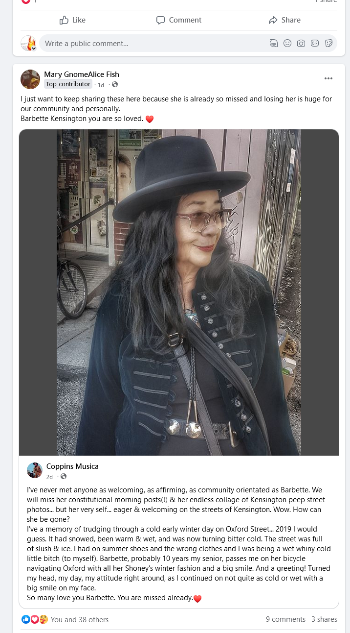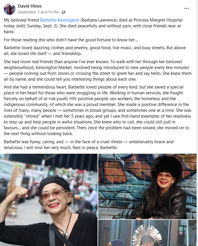 Barbette Kensington, one of the most wonderful people in Toronto, died this week.