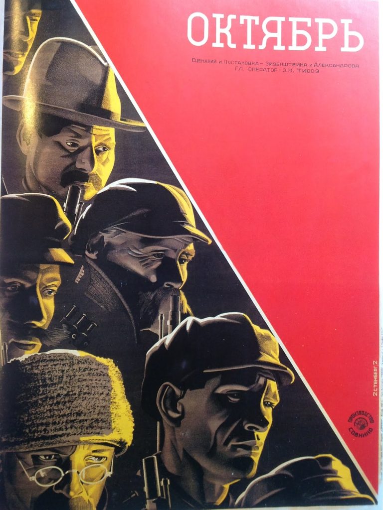 “Eisenstein’s October has a poster-like graphic quality which is complemented perfectly by Meisel’s work. Whilst its intention may have been ideological its tone is often anarchic and its atmosphere of delirious violence and insurrection is very different from that of Battleship Potemkin. October is a film that both Eisenstein and Meisel would have loved to see in this form, but alas never did.”–Brian Barford.