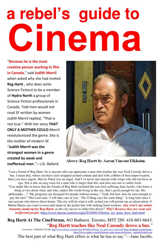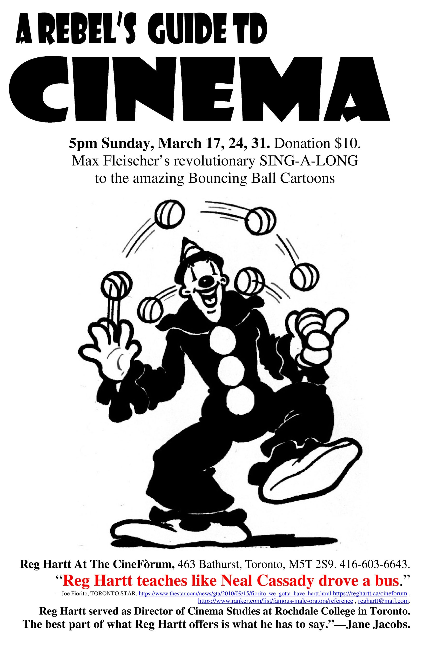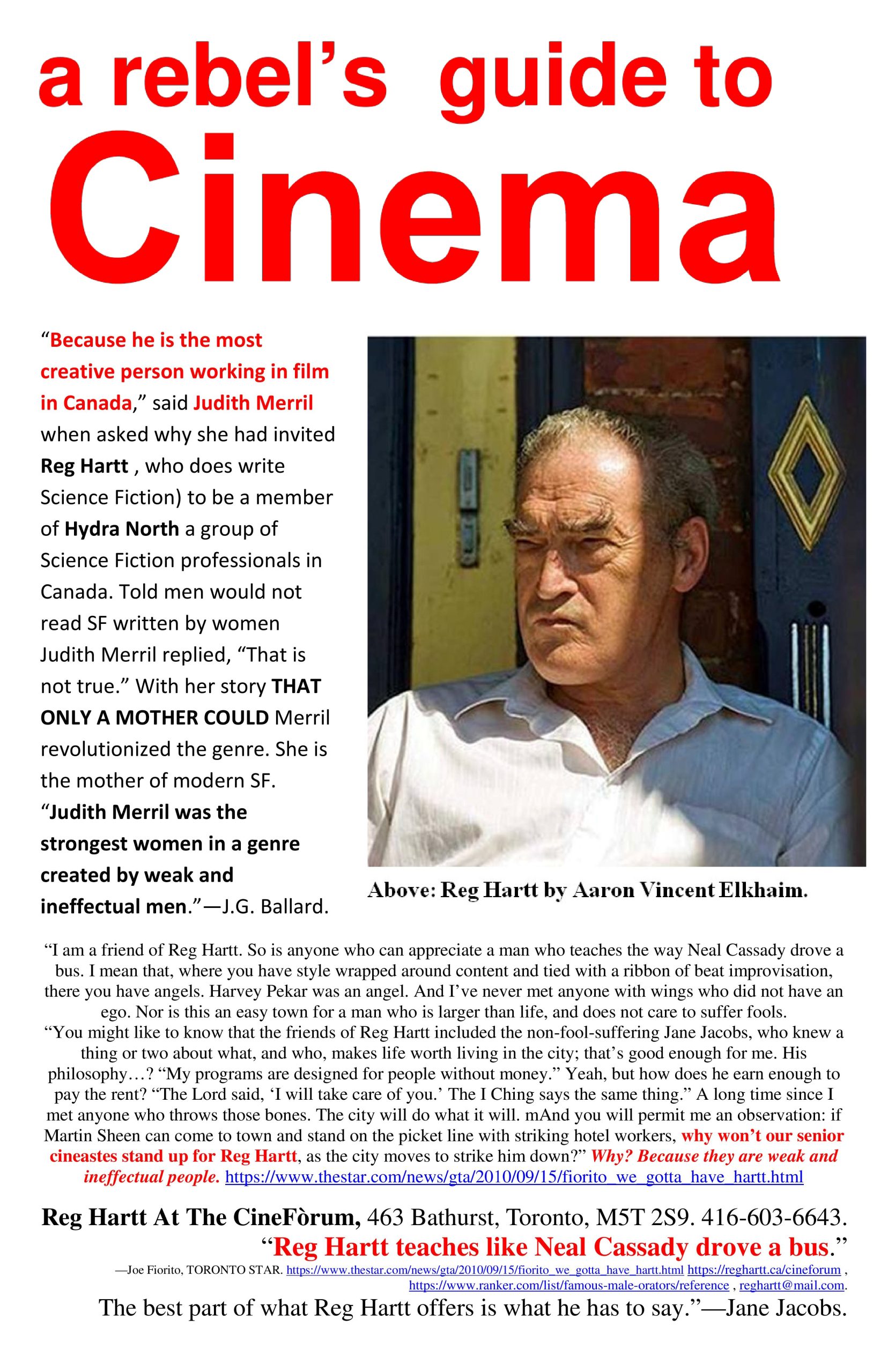 “What I like about The CineForum and Reg Hartt and what makes him a valuable figure is his belief in cinema as a living, breathing thing, something to be enjoyed and argued about, not genuflected at or framed on a wall and revered at a respected distance. In his presentations he refutes the conventional wisdom that films like THE BIRTH OF A NATION (1915), THE BATTLESHIP POTEMKIN (1925), and THE PHANTOM OF THE OPERA (1925) are better appreciated as historical artifacts than entertainments. To see KID DRACULA, his show that pairs F. W. Murnau’s NOSFERATU (1922) with Radiohead to surprisingly effective results is to be reminded that the classics were made for the raw public before they were made for cinema studies syllabi. I have rarely felt a film’s greatness in a classroom but I have often felt it at Reg Hartt’s CineForum.”—a cinema studies student.
