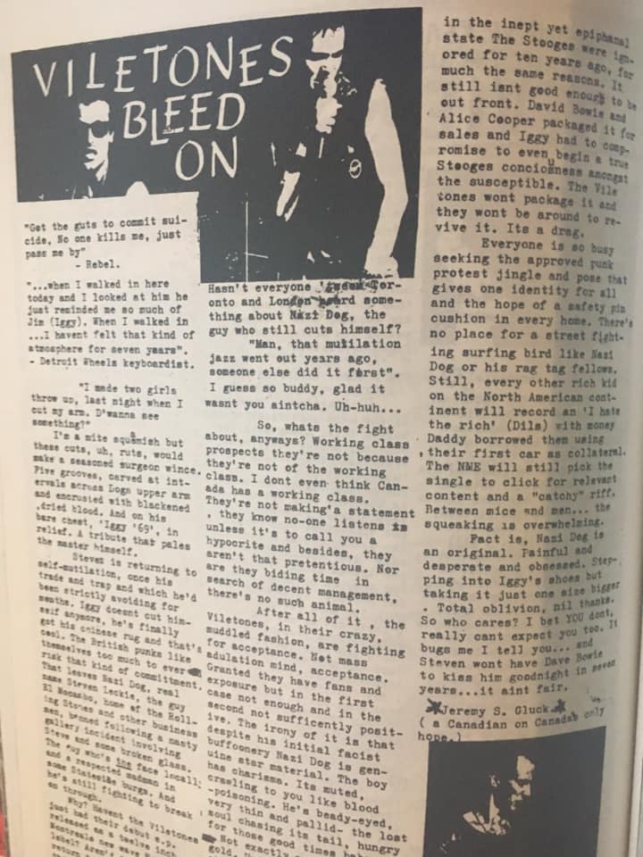 Music writer Paul McGrath reported on the concert (which included another punk band, the Poles) with a tone of pearl-clutching and contempt reflected in the over-the-top headline: “Not them! Not here!” Deeming the bands to be “unnecessary,” Mr. McGrath described the Viletones as a spectacle, not musicians.