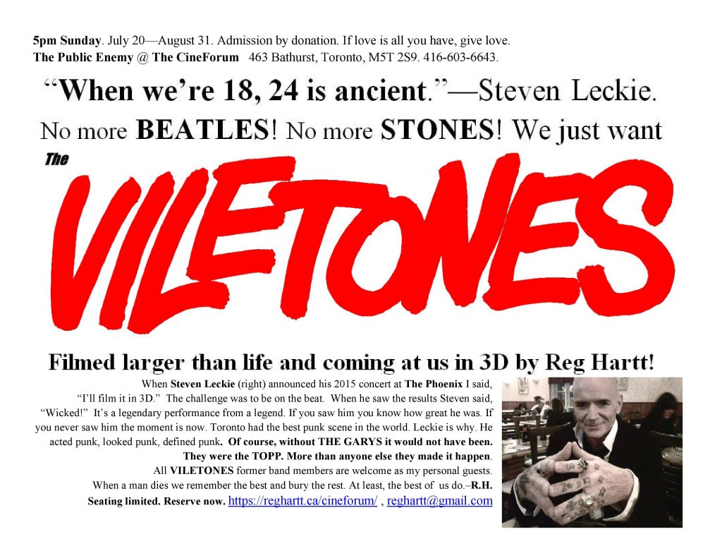Wearing a sneer, black eyeliner, and gaffer’s tape around his bare torso, Mr. Leckie sang Heinrich Himmler Was My Dad, slashed himself with the jagged edge of a broken beer glass and otherwise abandoned all decorum. Fans shouted, “No more Beatles, no more Stones, we just want the Viletones,” but not everyone was on board.