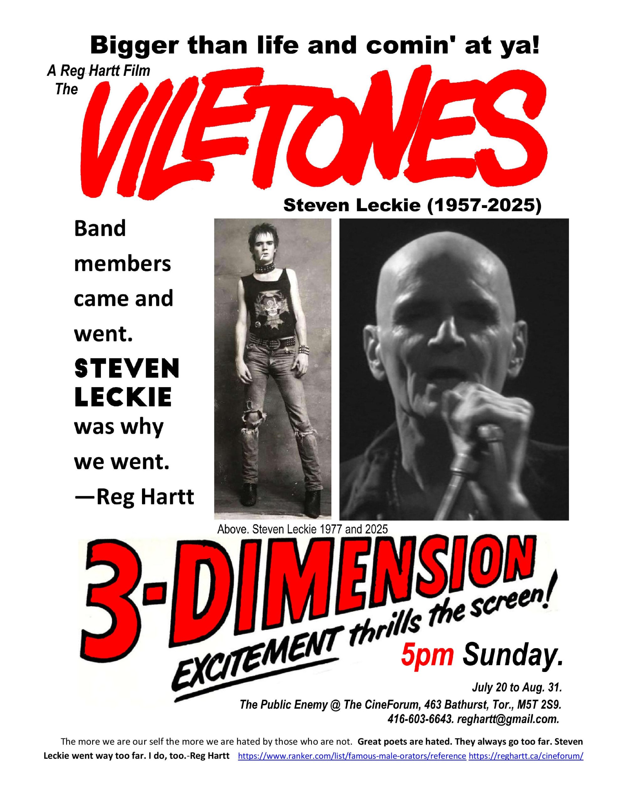 None of the other acts had a front man as charismatic and dramatic as Mr. Leckie, more an aggressive performance artist than a singer. Appearances by the Viletones suggested danger and incited violence. Mr. Lecke’s intense two-chord anthem Screaming Fist was a rally call for an outsiders’ community that excited some and frightened others.