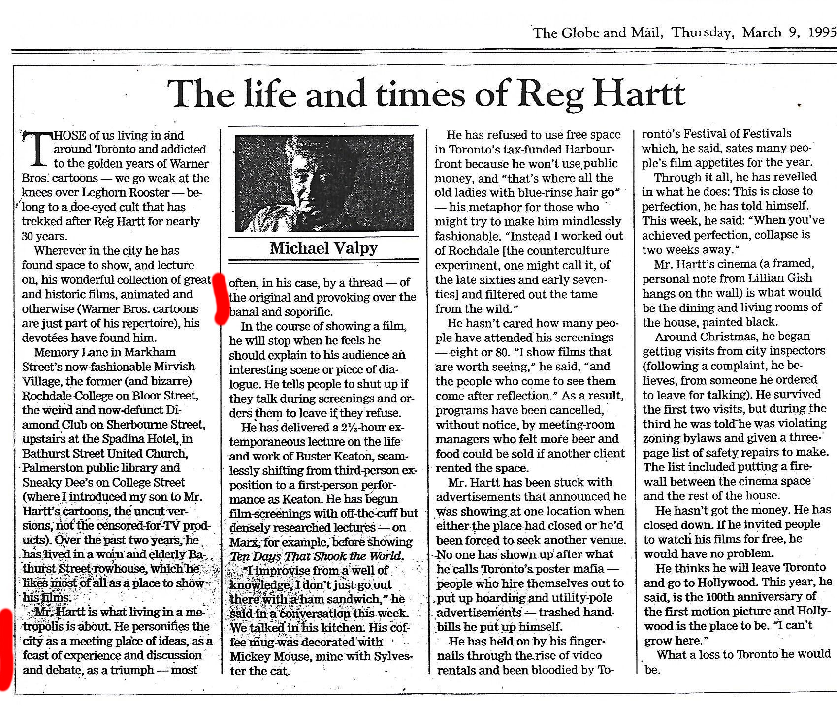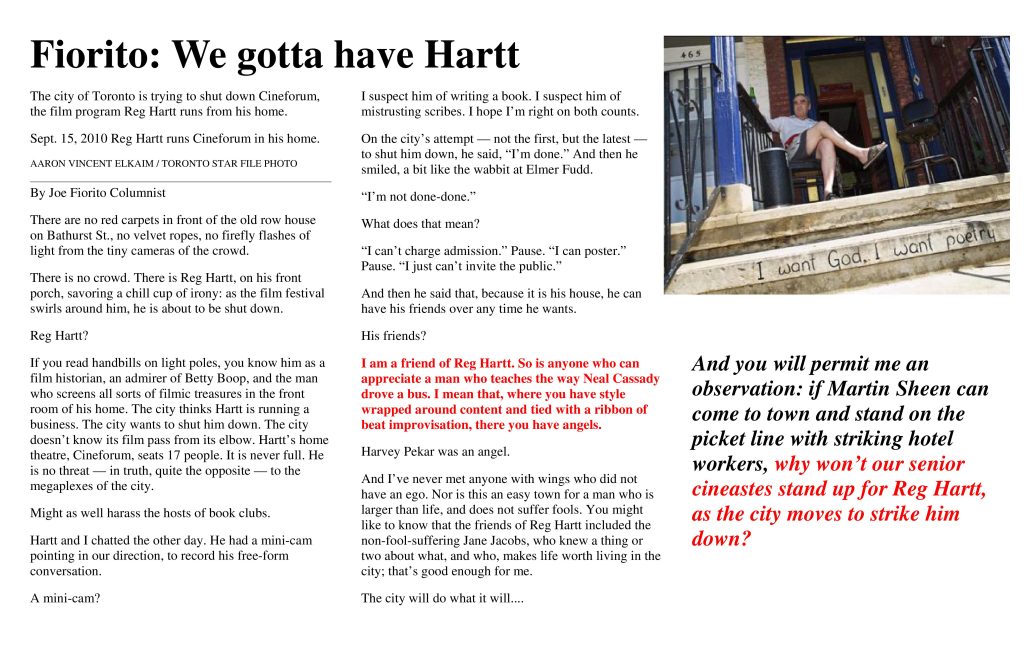 “And you will permit me an observation: if Martin Sheen can come to town and stand on the picket line with striking hotel workers, why won’t our senior cineastes stand up for Reg Hartt, as the city moves to strike him down?”