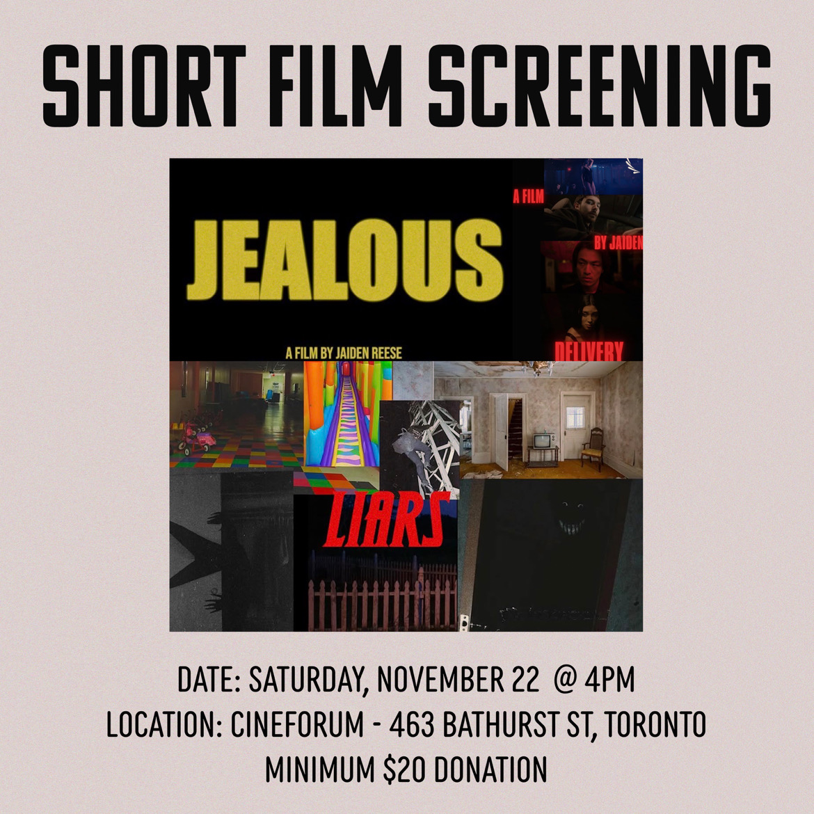 Filed Under: 1. Schedule by admin — Comments Off on Jaiden Reese Short Films at The CineForum. 4pm Saturday. Filmmaker present.