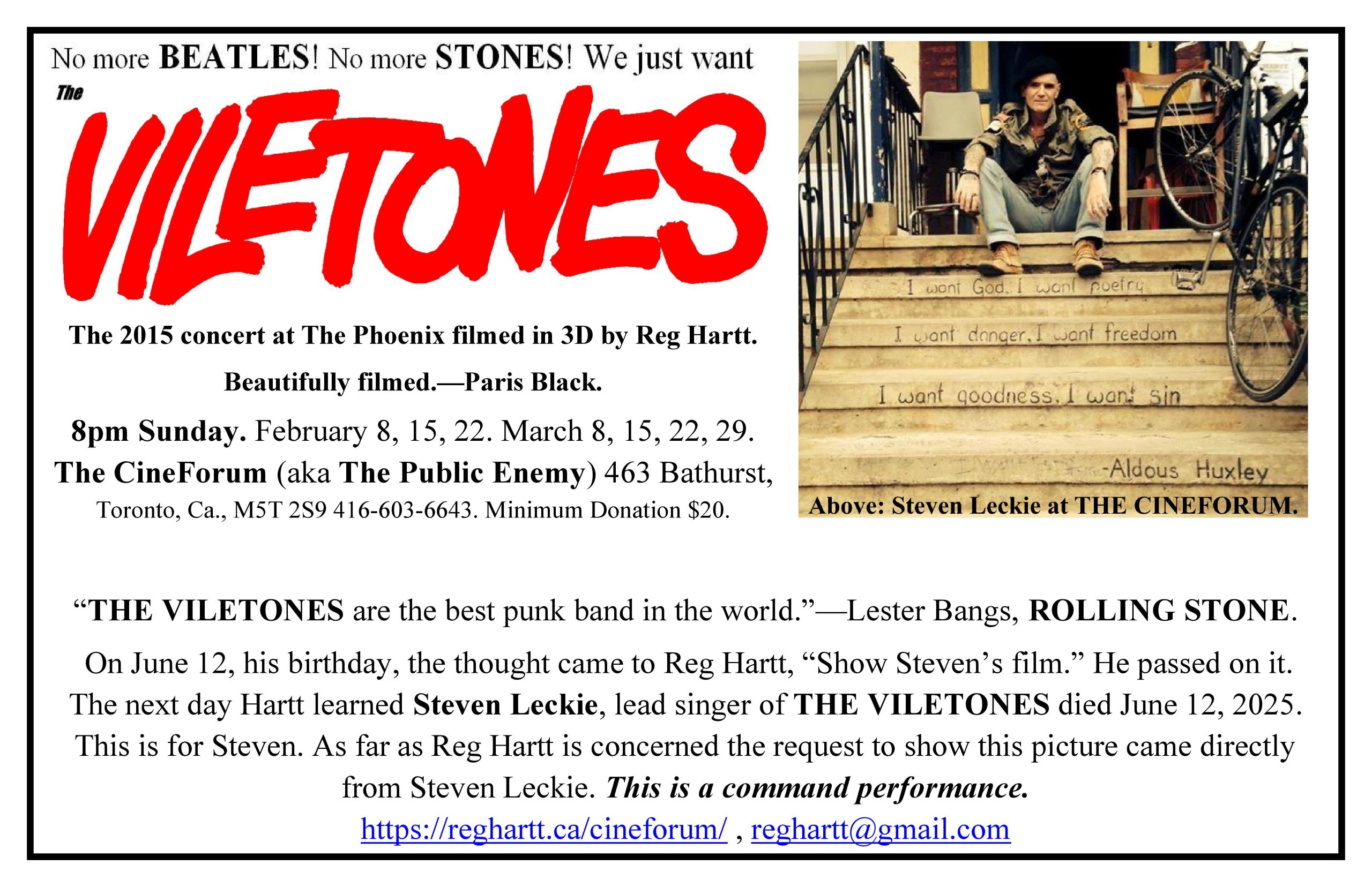 Wearing a sneer, black eyeliner, and gaffer’s tape around his bare torso, Mr. Leckie sang Heinrich Himmler Was My Dad, slashed himself with the jagged edge of a broken beer glass and otherwise abandoned all decorum. Fans shouted, “No more Beatles, no more Stones, we just want the Viletones,” but not everyone was on board.